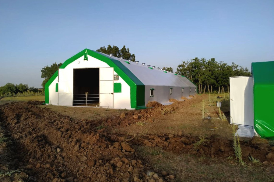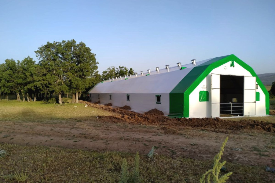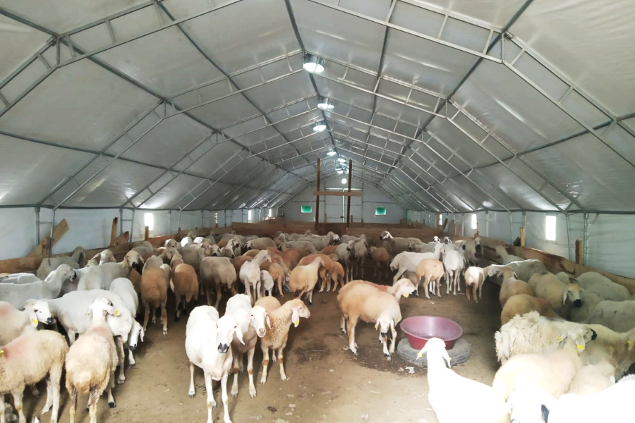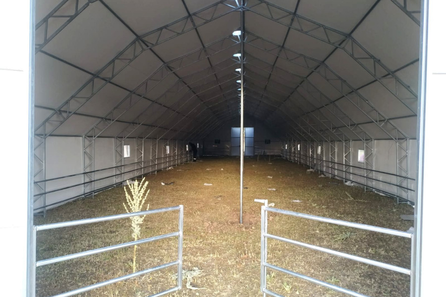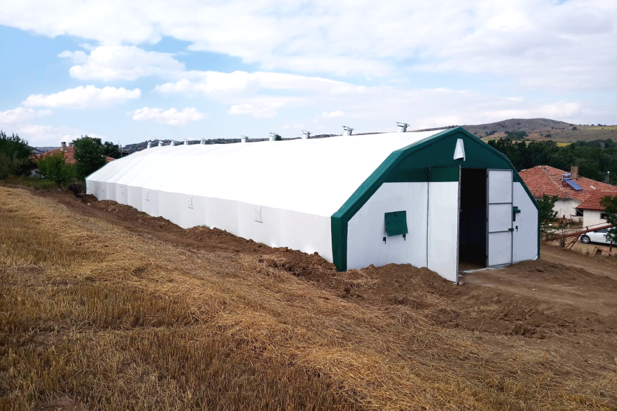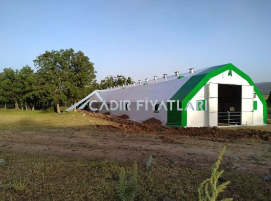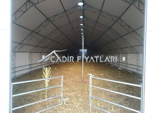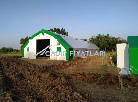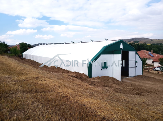 ·Makaslı yapı, makas profilleri çift sıra 30x30x1.5 mm boyutlarında. ·İçi ve dışı aynı oranda galvanizli ana taşıyıcılar. Gövde Özellikleri:1. Katman Astar: Özel dokuma, hava geçirgen polyevis dokuma branda kullanılır. 2. Katman izolasyon: Endüstriyel tip, özel yay teknolojisiyle sıkıştırılarak üretilmiş % 100 polyester çabuk kuruyabilen , ses yutum özelliğine sahip 550 (+/ - 50) gr/m² , özel yay teknolojisiyle ağırlığında beyaz renkli, özel üretim izolasyon malzemesi beyaz keçe.. 3. Katman izolasyon: Her iki yüzeyi folyo kaplı, içi hava kabarcıklı BİZOFOL ABA (220 (±20) gr/m²) 4. Katman Dış Kaplama Brandası : 650gr/m² (±50gr/m²) ağırlığında -30/+70 derece ısıya dayanıklı, alev yürümezlik belgesine sahip 1. sınıf sentetik branda kullanılmaktadır. Alın ve Kapı Detayları:·Alın kısımları, ana katman brandası ile aynı özelliklere sahip brandadan tek katmanlıdır. ( tercihen yalıtım yapılabilir.) · ·İki adet 2,40X2,70 M ölçülerinde çift kanatlı kelebek kilitlenebilir kapı. Ayrıca çadırımızda servis kapısı bulunmaktadır. Havalandırma ve Pencere Özellikleri:·Özel havalandırma sistemleriyle menfezlerle hava akışı sağlanmaktadır. Çadırın ön tarafında : 2 adet Çadırın arka tarafında : 2 adet cırtlı branda kapaklı fiber tüllü pencereler bulunmaktadır. Sağ yan tarafta : 5 adet Sol Yan : 5 adet - 10 adet metal çerçeveli fiber tüllü pencereler Mahya havalandırma : 5 adet Diğer Hususlar:1. Zemin hazırlığı müşterimiz tarafından yapılacaktır. Zeminin beton olması durumunda beton ölçüleri firmamız tarafından verilecektir. 2. Montaj esnasında ihtiyaç duyulabilecek iş makinası (vinç, kepçe vb.) ve elektrik (yoksa jeneratör) temini müşteriye aittir. 3. Montaj sonrasında çadır yapının eteklerinin, firma teknik personelinin tarif edeceği şekilde gömülmesi işlemi müşteriye aittir. 4. Beton zeminde, firmamızın çizim olarak verdiği ölçülerde beton atılmalı, ayrıca beton dış kenarlarından yine dışa doğru en az 2m çalışma alanı olmalıdır. Ayrıca bu çalışma sahası ölçüleri içerisinde çalışmaya ve montaja engel (duvar, yamaç, tel örgü, ağaç vb.) hiç birşey olmamalıdır. Değerlendirilirken Dikkat Edilmesi Gereken Önemli Hususlar :1. Kullanılan boru ve profillerin içi ve dışının aynı oranda galvaniz kaplı olması, (Bu özellik çadır yapının iskelet ömrünün %50 daha fazla olması için önemlidir.) 2. Çadır yapının iç hacmi, (özellikle portatif ağıllarda hayvan açısından iç hacim çok önemlidir.) 3. Çadır yapının hangi şartlarda ve nasıl bir ortamda imal edildiğini ziyaret ederek karar veriniz.