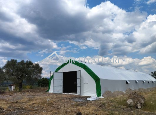 ü Önde 2,40 m x 2,80 m menteşe kilit mekanizmalı kelebek kapısı mevcuttur. (Depo çadırlarında sürgülü kapı kullanılabilir.)